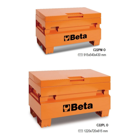 Szerszámos műhelyláda, lemezből süllyesztett fogantyúk emelt csúszótalpak targoncás felemeléshez felfeszítésbiztos lakatolható kettős zár (lakat nélkül) kettős zár (lakat nélkül) C22PM O: ? 39 kg C22PL O: ? 67 kg