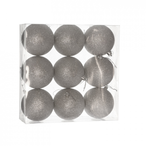 Műanyag gömb dobozban 8 cm ezüst glitteres Hogy szebbé tegyük a karácsonyt egy szép nagy ezüst glitteres gömbbel a karácsonyfán. Csomagolási egység : doboz 1 doboz 9 db Gömb átmérő : 8 cm