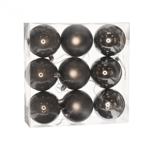 Műanyag gömb dobozban 8 cm Grafit szürke 3 féle Hogy szebbé tegyük a karácsonyt egy szép nagy 3 féle Grafit szürke gömbbel a karácsonyfán. Csomagolási egység : doboz 1 doboz 9 db Gömb átmérő : 8 cm