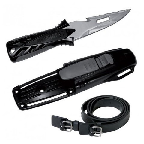 Kétélű 83x4mm 304 AISI rozsdamentes acél penge huzalvágóval és kengyelkulccsal. Dupla zárral ellátott késtok: puha markolatú szár és védőburkolat Rögzítő szett a mellényen vagy az inflátor csövön való elhelyezéshez. A rozsdamentes acél pengével rendel