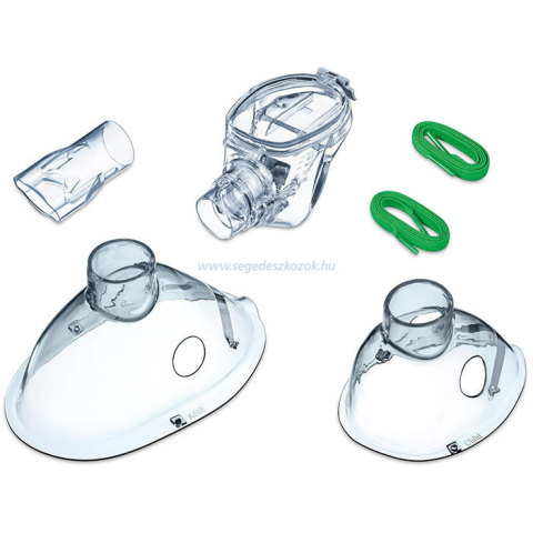 1 db szájrész 1 db felnőtt maszk 1 db gyermek maszk 1 db gyógyszertartó hálós porlasztóval Csak Beurer IH 55 készülékkel történő használatra