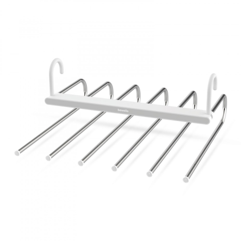 Praktikus, kompakt méretű eszköz, amely segít megoldani és hagytakarékosan szárítani törölközőit vagy éppen a szekrényben tárolni nadrágjai. Az akasztók segítségével bármelyik szekrényben rögzíthető, alkalmas 6 db nadrág egyidejű tárolására. Egyszerűen r