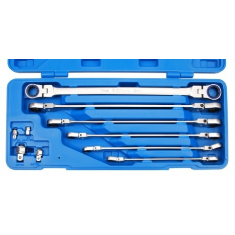 Króm-vanádium acélból készült;Extra hosszú kivitel;Csuklós fejek.A készlet tartalma:6 db racsnis csillagkulcs: 8x9 mm (237 mm hosszú), 10x11 mm (294 mm hosszú) 12x13 mm (327 mm hosszú), 14x15 mm (370 mm hosszú) 16x18 mm (409 mm hosszú), 17x19 mm (4