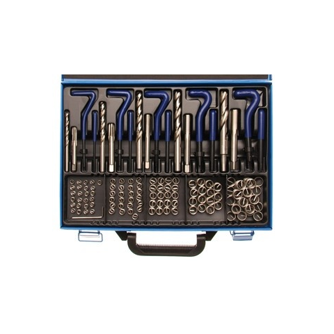 Menetjavítás professzionális szinten; HSS-G acél fúrószárakkal; Szortírozós kofferben. A készlet tartalma: 5 db HSS-G menetfúró 5 db HSS-G csigafúró 5 db speciális beszerelő szerszám 5 db csaptörő 110 db menetes persely az alábbi összeállításban: 25