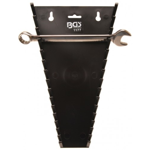 Falra szerelhető villáskulcs tartó 15 db kulcsnak. Mérete: 297 x 180 x 28 mm Műanyag, fekete. (Kulcs nem tartozék)Élettartam anyag- és törésgarancia!