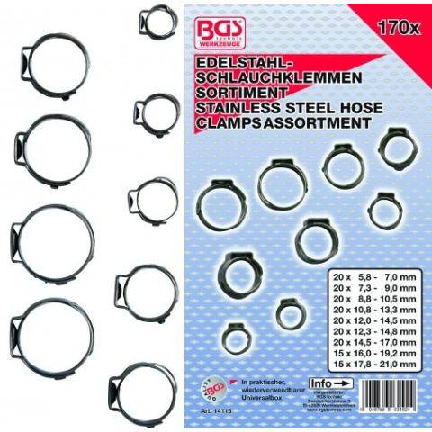 A BGS 161 és 8359 szorító bilincs fogókkal is jól használható.A készletben lévő méretek:20 db 5.8 - 7.0 mm20 db 7.3 - 9.0 mm20 db 8.8 - 10.5 mm20 db 10.8 - 13.3 mm20 db 12.0 - 14.5 mm20 db 12.3 - 14.8 mm20 db 14.5 - 17.0 mm15 db 16.0 - 19.2 mm15 db 17