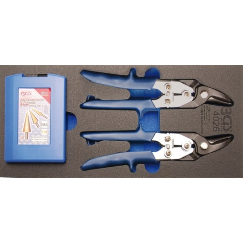 1 kép BGS 1/3 szerszámkocsi fiók 5 részes lépcsősfúró / lemezvágó olló készlettel