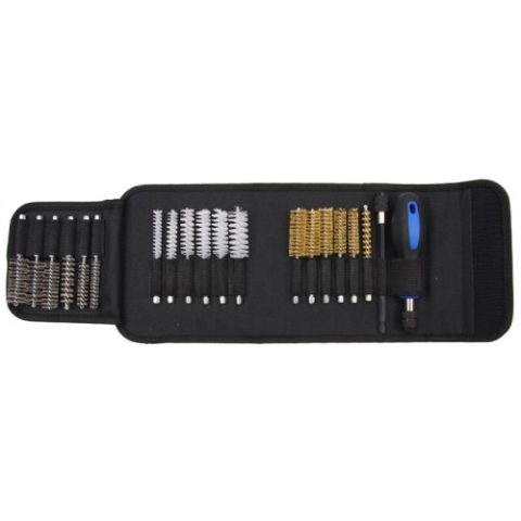20 részes készlet: 6x sárgaréz kefe; 6x nylon-műanyag; 6x rozsdamentes kefe 1/4-os befogással 1x hosszabbítószár 150 mm; 1x 1/4 befogó a gyors kézi használathoz 1/4-os gyorsrögzítős bit-befogás. Átmérők: 9 - 11 - 13 - 15 - 17 - 19 mm Szövetes hordozha