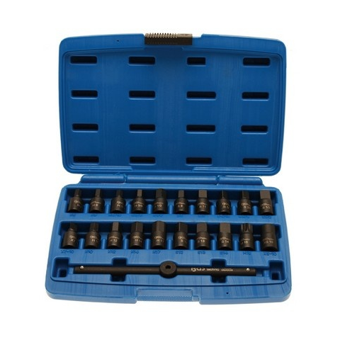 Szállítási terjedelem: 9 hatszögletű betét 8 - 9 - 10 - 12 - 14 - 17 mm, 8 mm (5/16) - 10 mm (3/8) - 12,5 mm (1/2) 5 négyszögletű betét 8 - 11 - 12 - 13 - 14 mm, 8 mm (5/16) - 10 mm (3/8) - 12,5 mm (1/2) 1 belső négyszögletű 10 mm 1 külső háromszögle