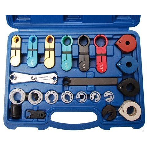 Leszerelő és kireteszelő szerszámok nehezen nyitható vezetékcsatlakozókhoz légkondicionálókhoz, üzemanyag-, levegő- és olajvezetékekhez alkalmas az összes járműtípushoz Műszaki adatok: Bruttó súly 1050 g