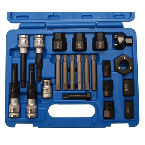 Speciális bitkészlet generátor-kombikulcsokkal (klímakompresszorokhoz is), a túlfutó szíjtárcsa felszereléséhez és leszereléséhez Szállítási terjedelem: Többfogú betét 15 mm, 33 fog, Ø17,5 mm Többfogú betét 15 mm, 33 fog, Ø19,5 mm Többfogú betét 22 m