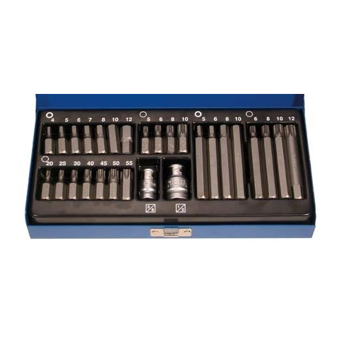fémkofferben Szállítási terjedelem: 7 behajtófej, rövid, belső hatszögletű: 4 - 5 - 6 - 7 - 8 - 10 - 12 mm 4 behajtófej, belső hatszögletű: 5 - 6 - 8 - 10 mm 4 behajtófej, rövid, belső fogazású (XZN): M5 - M6 - M8 - M10 4 behajtófej, hosszú, belső fo