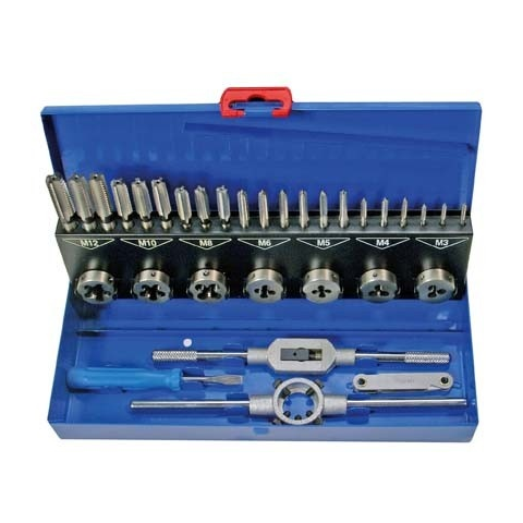 - 7 mérető menetfúró (DIN 352) - 7 mérető menetmetsző (DIN 223) 25 x 9mm M3 x 0,5 - M4 x 0,7 - M5 x 0,8 - M6 x 1,0 M8 x 1,25 - M10 x 1,5 - M12 x 1,75 - 1 db metsző tartó (DIN 225) 25 x 9mm - 1 db fúró tartó (DIN 1814) # 1,5 - 1 db menetemelkedés mérő