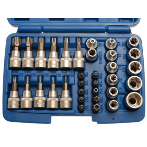 Króm-vanádium acélból készül;Matt króm bevonat.A készlet tartalma:11 db Torx bitfej, 10 mm (3/8), 75 mm-es hossz: T10 - T15 - T20 - T25 - T27 - T30 - T40 - T45 - T50 - T55 - T6010 db biztonsági (fúrt) Torx bit, 8 mm (5/16): T10 - T15 - T20 - T25 - T27