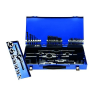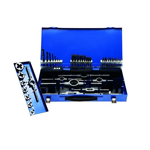 Masszív, hordfüles fém dobozban.A készlet tartalma:21 db menetfúró szár (DIN 352), 1 elővágó, 1 közép vágó, 1 fő vágó az alábbi méretekhez: M3 x 0.5 - M4 x 0.7 - M5 x 0.8 - M6 x 1.0 - M8 x 1.25 - M10 x 1.5 - M12 x 1.757 db menetmetsző (DIN 223): M