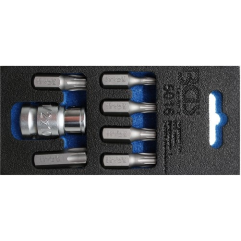 T-profil (Torx) csavarozófejekhez Szállítási terjedelem: 6 behajtófej, hossza 30 mm, külső hatszögletű kulcsnyílású hajtás 10 mm (3/8), T-profil kihajtófej (Torx) csavarozófejek T25 - T30 - T40 - T45 - T50 - T55 1 golyós behajtófej-adapter, 12,5 mm (