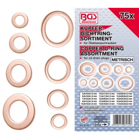 1 kép BGS 75 db-os réz tömítőgyűrű készlet, metrikus olaj leeresztő csavarhoz