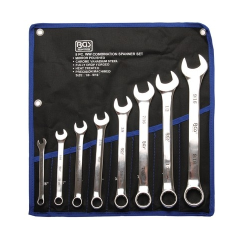 Anyaga: Króm-vanádium acélból készül Polírozott kivitel Colos méretezésű: 1/8; 3/16; 1/4; 5/16; 3/8; 7/16; 1/2; 9/16; Falra akasztható zsebes tárolóbanÉlettartam anyag- és törésgarancia!