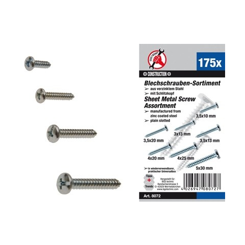 Felakasztható műanyag szortírozóban Egyhornyú csavarfejek Galvanizált acél A készlet tartalma: - 50 db lemezcsavar: 3 x 13 mm - 40 db lemezcsavar: 3.5 x 10 mm - 30 db lemezcsavar: 3.5 x 13 mm - 20 db lemezcsavar: 3.5 x 20 mm - 15 db lemezcsavar: 4 x 2