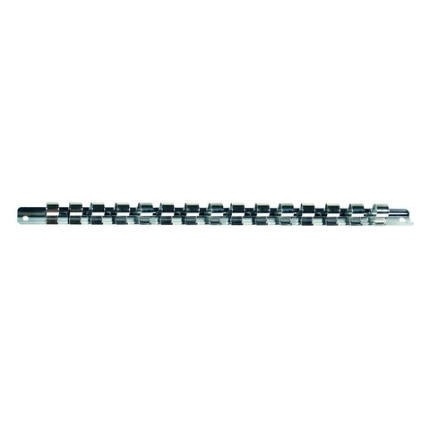 Krómozott kivitelű fém sín 15 db 3/8-os dugófej tárolásához. Teljes hossz: 410 mm, tartozék: 15 db klipszÉlettartam anyag- és törésgarancia!