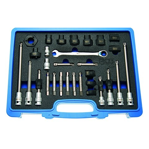 Generátor szíjtárcsák leszereléséhez speciális betéteket, kulcsokat és bitbetéteket tartalmaz: Betét 3 furató csavarokhoz, 28 mm-es lyukkör, 3x 4 mm-es csapokkal, 38 Betét 4 furató csavarokhoz, 26 mm-es lyukkör, 4x 4 mm-es csapokkal, 15 Hatszögletű h