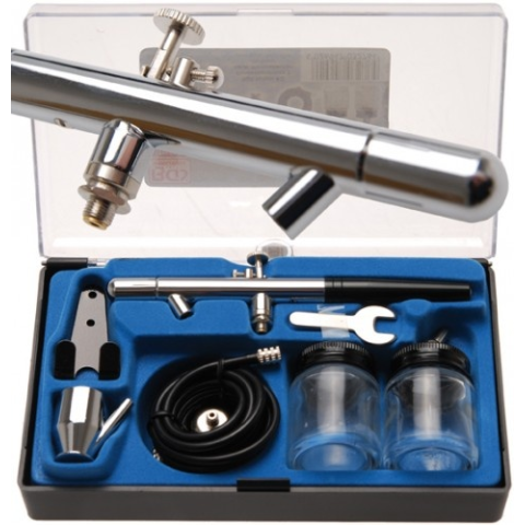 beállítható szórási minta 6,3 mm (1/4) levegőtömlőhöz 1,0 - 3,5 bar különböző tartozékelemek: pisztolytartó, tömlő, tartály fúvóka átmérője 0,35 mm Műszaki adatok: Bruttó súly 390 g