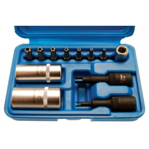 Speciális csavarfejekhez fejlesztett készlet - klíma és vezérlőegység szereléséhez. Csatlakozás: 1/4 belső négyszög Anyag: speciális szerszámacél / króm-molibdén acélötvözet Tartalma: - 4 db dugókulcs légkondicionáló csavarokhoz (Audi / VW / Opel) - 7