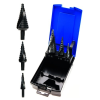 - Készlet tartalma: 3 db lépcsős fúró - Méretek: 4-12 mm, 4-20 mm, 6-30 mm - Anyaga: HSS acél 6542 - Nitrid felületÉlettartam anyag- és törésgarancia!