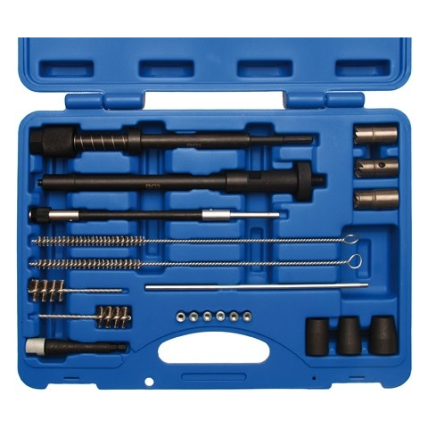 az injektorülékek és az izzítógyertyák üregének tisztításához Szállítási terjedelem: 4 tisztító kefe Kefetartó 3 injektorülék-maró maróvezető tömítőgyűrű-lehúzó Kefetartó-hosszabbító Műszaki adatok: Bruttó súly 2410 g