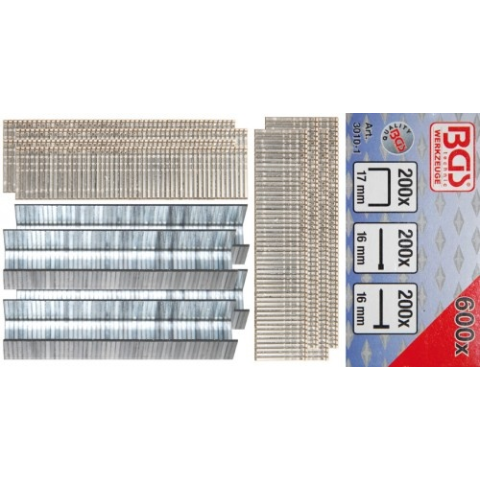 A készlet tratalma:200 db kapocs: 17 mm hosszú200 db csap (stift): 16 mm hosszú200 db szeg: 16 mm hosszúÉlettartam anyag- és törésgarancia!