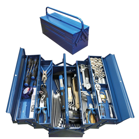Króm-molibdén és króm-vanádium acélból készült szerszámok;Acéllemezből készült szerszámosláda;Különösen masszív konstrukció;200 x 530 x 200 mm-es méret.A szerszámkészlet tartalma:1 db oldalcsípő fogó, 165 mm1 db kombinált fogó, 160 mm4 db Seeger gyűrű