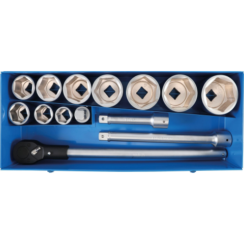- Króm-vanádium acélból készül - 24 fogú reverzibilis racsnis hajtószár - 2 hosszabbító szár: 200 mm - 400 mm - 500 mm hosszú szár + adapter, a beragadt csavarok meglazítására - Racsnis hajtószár hossza: 680 mm - 10 db hatszög dugókulcs: 36 - 41 - 4