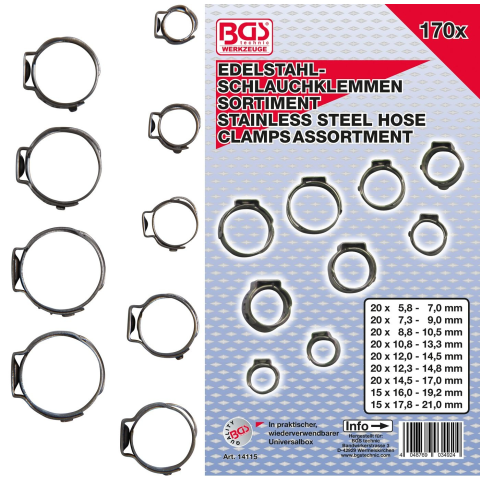 A BGS 161 és 8359 szorító bilincs fogókkal is jól használható.A készletben lévő méretek:20 db 5.8 - 7.0 mm20 db 7.3 - 9.0 mm20 db 8.8 - 10.5 mm20 db 10.8 - 13.3 mm20 db 12.0 - 14.5 mm20 db 12.3 - 14.8 mm20 db 14.5 - 17.0 mm15 db 16.0 - 19.2 mm15 db 17
