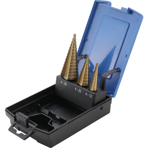 HSS acélból készül; 2 mm-es lépcsők. A készlet tartalma: 1 db 4-12 mm fúró 4, 5, 6, 7, 8, 9, 10, 11, 12 mm-es lépcsőkkel 1 db 4-20 mm fúró 4, 6, 8, 10, 12, 14, 16, 18, 20 mm-es lépcsőkkel 1 db 4-30 mm fúró 4, 6, 8, 10, 12, 14, 16, 18, 20, 22, 24, 26,