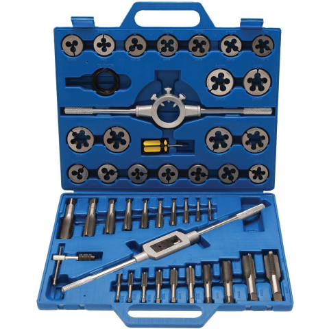 Volfrám-karbid acélból készül;Col méretek.A készlet tartalma:1 db csúszószáras menetfúró hajtókar1 db állítható hajtókar menetfúró hajtószárakhoz1 db menetmetsző hajtókar1 db adapter a menetmetsző hajtókarhoz20 db menetfúró szár20 db menetmetsző1 db l