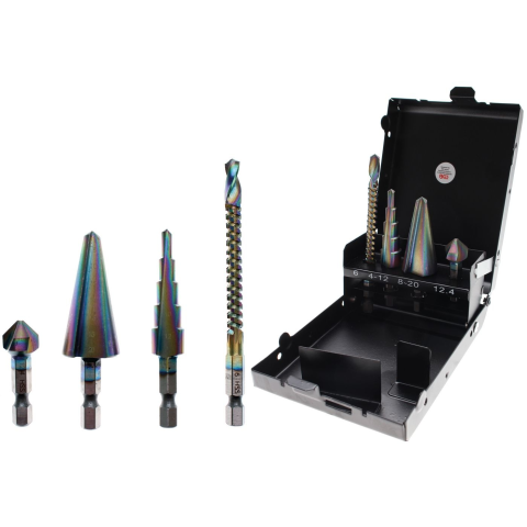 Lépcsős fúró 4 - 12 mm Kézi fúró 8 - 20 mm Marófúró 6 x 90 mm Süllyeszték 12,4 mm Műszaki adatok: Bruttó súly 290 g Blister csomagolásban Igen