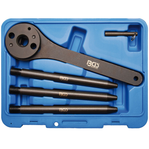 Főtengely szíjtárcsák szakszerű és kíméletes szereléséhez;VW T4, Audi A3 és további számos típushoz használható.A készlet tartalma:Kíhúzó tárcsa 8 vájattal a lehúzókaroknak és csavaroknak17 mm-es lehúzótengely szabadon forgó nyomófejjel, 19 mm-es hatl