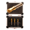 Ponthegesztés lefúró készlet. A termék jellemzői: A speciális HSS kobaltacél megakadályozza a túlmelegedés miatti tompulást A középpont megakadályozza a fúró elmászását Bruttó súly: 128 g Anyag: HSS acél Felületkezelés: titán-nitridált A kész