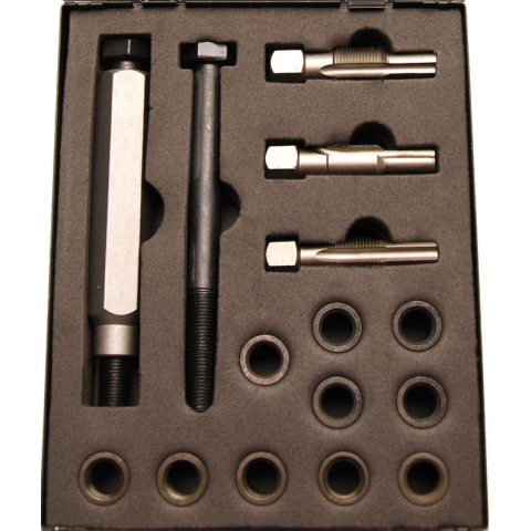 Kiváló megoldás a hengerfej izzítógyertya menetének javítására.A készlet tartalma:1 db menetfúró szár az eredeti menet tágításához1 db fúrószár az eredeti menet rövidítéséhez1 db menetfúró szár a menetjavító perselyhez1 db beillesztő szerszám menetjav