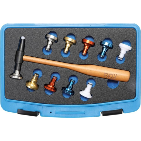 horpadáseltávolításhoz a karosszéria területén a különböző fejek maguktól biztonságosan rögzülnek a reteszelésben 1 kalapács, 235 mm hosszú 10 cserélhető fej, mindegyik lapos és félkör alakú, Ø 28 mm, az alábbi színekben: 2 műanyag fej, fehér 2 alumín