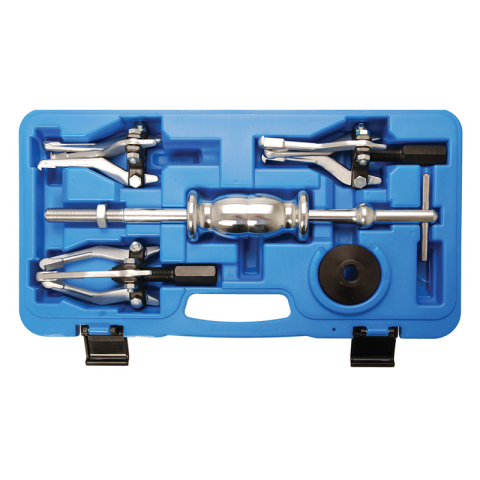 Csúszókalapácsos csapágylehúzó készlet. A termék jellemzői: Alkalmas külső és belső cspágyakhoz. Anyag: edzett szerszámacél Műanyag kofferben szállítva. Működési tartományok: Külső: 40-80 mm Belső: 50-150 mm Bruttó súly: 4660 g
