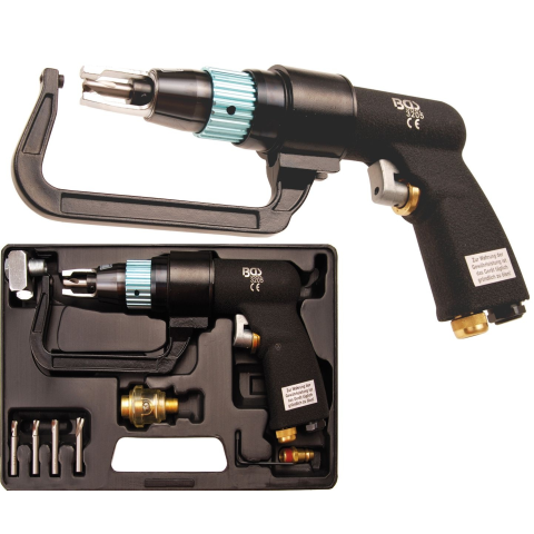 Levegős működésű ponthegesztő lefúró gép (pisztoly) készlet Tartalma: 1 db levegő gép (piszoly) hátsó megtámasztó fejjel, 1 db napi olajzó egység, 5 db ponthegesztés lefúró fej (2 db 6,5 mm-es és 3 db 8,0 mm-es) 1 db Imbuszkulcs a szerszámcseréhez, 1