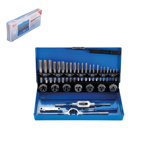 Metrikus méretezésű 32 részes kézi menetfúró és menetmetsző készlet fém tárolódobozban.