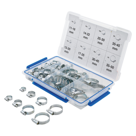Szortimentdobozban Szállítási terjedelem: 15 Tömlő bilincs Ø 13 - 16 mm 15 Tömlő bilincs Ø 12 - 20 mm 10 Tömlő bilincs Ø 16 - 22 mm 10 Tömlő bilincs Ø 19 - 25 mm 10 Tömlő bilincs Ø 25 - 35 mm 10 Tömlő bilincs Ø 30 - 40 mm 5 Tömlő bilincs Ø 35 - 45 mm