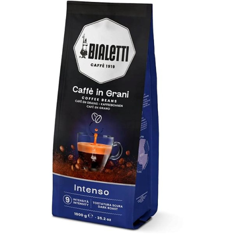 Kávé - szemes, kávéfajták keveréke, kakaó aroma, sötét, származási hely Olaszország, pörkölés helye Olaszország, csomag tömege 1100 g Bialetti Intenso szemes kávé1000 gA Bialetti Intenso szemes kávé sötét pörkölési profilt kínál. 50%-ban arabica és 50%-ban robusta kávé alkotja. Egyedülálló ízzel tűnik ki, amelyben a pirított kenyér