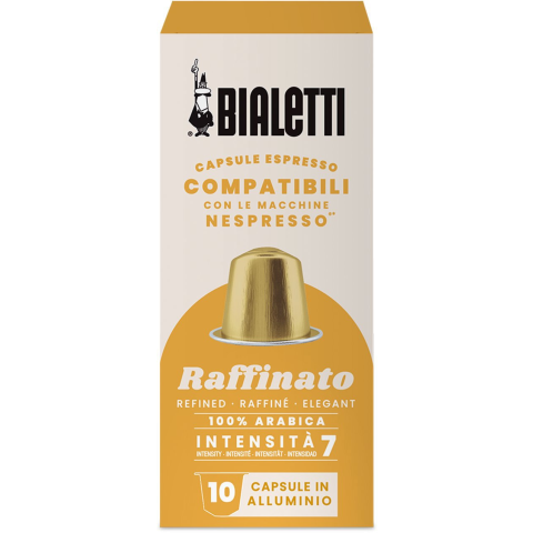 Kávékapszula - espresso, 100% arabica, medium (intenzitás 7), gyümölcsös és virágos tónusú, származási helye Dél-Amerika, műanyag anyagú kapszula, 10 kapszulát tartalmaz Bialetti Nespresso Raffinato kávékapszulák10 kapszulaA Bialetti Nespresso Raffinato kávékapszulák lehetővé teszik, hogy ízletes kávét készíts Nespresso® Original kávéfőzőkben. 100% Arabica kávét rejte