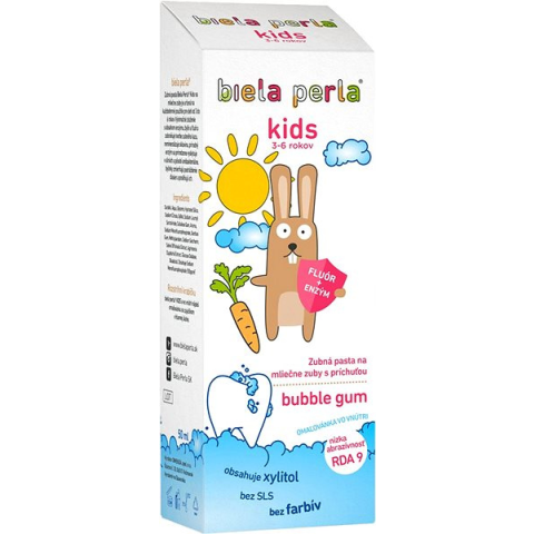Fogkrém - gyermek, fogszuvasodás elleni védelem, rágógumi ízű, 50 ml kiszerelésben kapható A BIELA PERLA Kids Bubble Gum 50 ml gyermek fogkrém kifejezetten 3-6 éves gyermekeknek készült. Gyógynövénykivonatokat, természetes enzimeket és fluort tartalmaz, amelyek együttesen átfogó védelmet ny