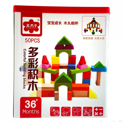 Kíváló minőségű fajáték. Doboz mérete: 14 x 24 50db-os színes fakockákból álló építőjáték.