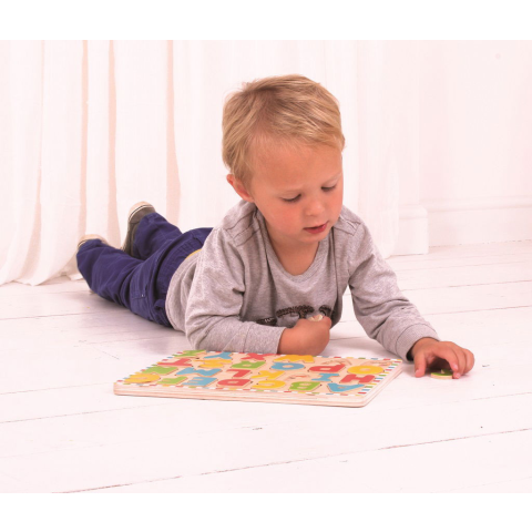 Bigjigs készségfejlesztő játék fa angol ABC nagy betűk formák képekkel