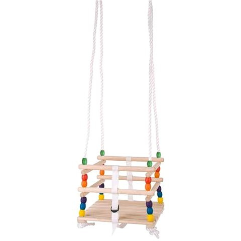 Hinta - gyerek, kertbe helyezhető, fa, felakasztható, védőkorlát, kiesés elleni védelem, háttámla a csomag része, terhelhetősége 25 kg, mérete 112 × 30 cm (Ma×Sz), maximális felfüggesztési hossz 112 cm, többszínű, ajánlott 1 éves kortól Gyermeked számára ideális választás ez a fából készült hinta, melyet színes fagyöngyök díszítenek minden oldalról és extra kiesésgátló pántokkal rendelkezik. Tökéletes megoldás, hogy a totyogók m